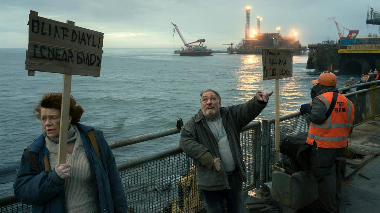 No gulls, no waves, just the dull metallic echo of drills biting into the seabed somewhere beyond the horizon. On a cold pier at dawn, a group of locals stand with cardboard signs wilting in the salty air: “Schools, not tunnels” and “We can’t eat your high-speed dreams.” A ferry worker points out at the construction barges and laughs without humor. “They say it’ll link continents,” he mutters. “I just see my taxes sinking.”