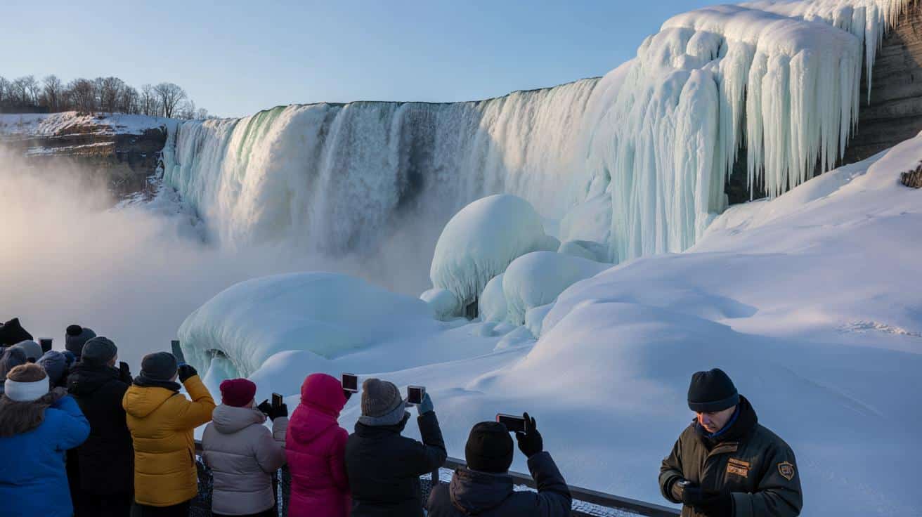 On social media, the images explode. Aerial shots show the Horseshoe Falls wrapped in a shell of ice, with only a few streams of unfrozen water punching through like veins. Headlines scream **“Niagara Falls Completely Frozen!”** even though water still flows under the surface, as it almost always does.